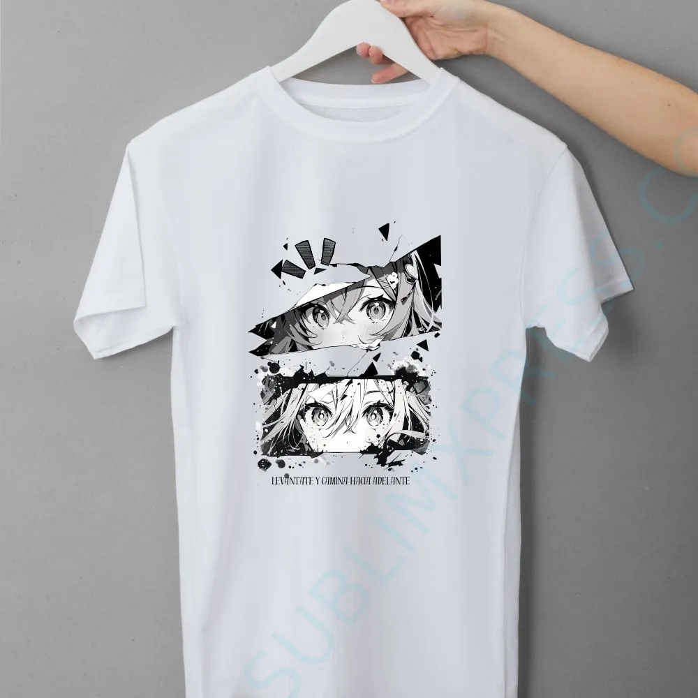 Camiseta blanca estilo manga (ojos grandes, paneles “rotos”, salpicaduras). Impresión DTF de alta definición sobre tela cómoda y durable. Ideal para amantes de la ciencia.