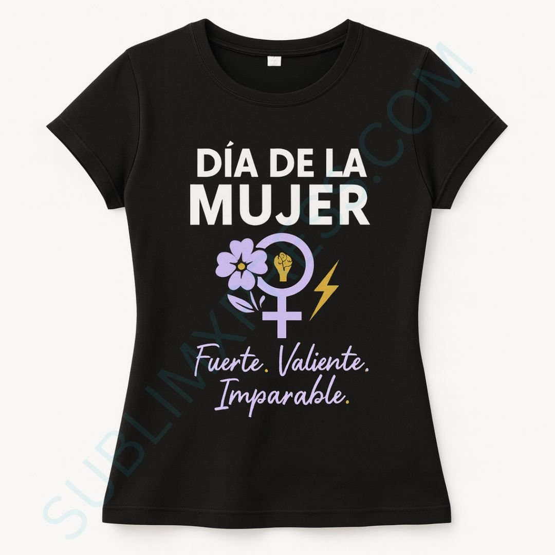 Camiseta negra ‘Día de la Mujer’ con frase “Fuerte. Valiente. Imparable.” Impresión DTF de alta definición en el frente. Una camiseta cómoda y duradera (también llamada playera o franela en algunos países), ideal para regalar el 8M o para usar todo el año.