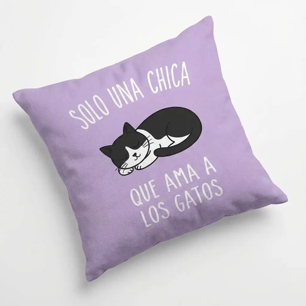 Este cojín “Solo una chica que ama a los gatos” es perfecto para quienes sienten debilidad por los mininos y quieren que se note en la decoración. El diseño combina un fondo lila con un dibujo de un gato blanco y negro durmiendo y una frase clara en letras blancas.